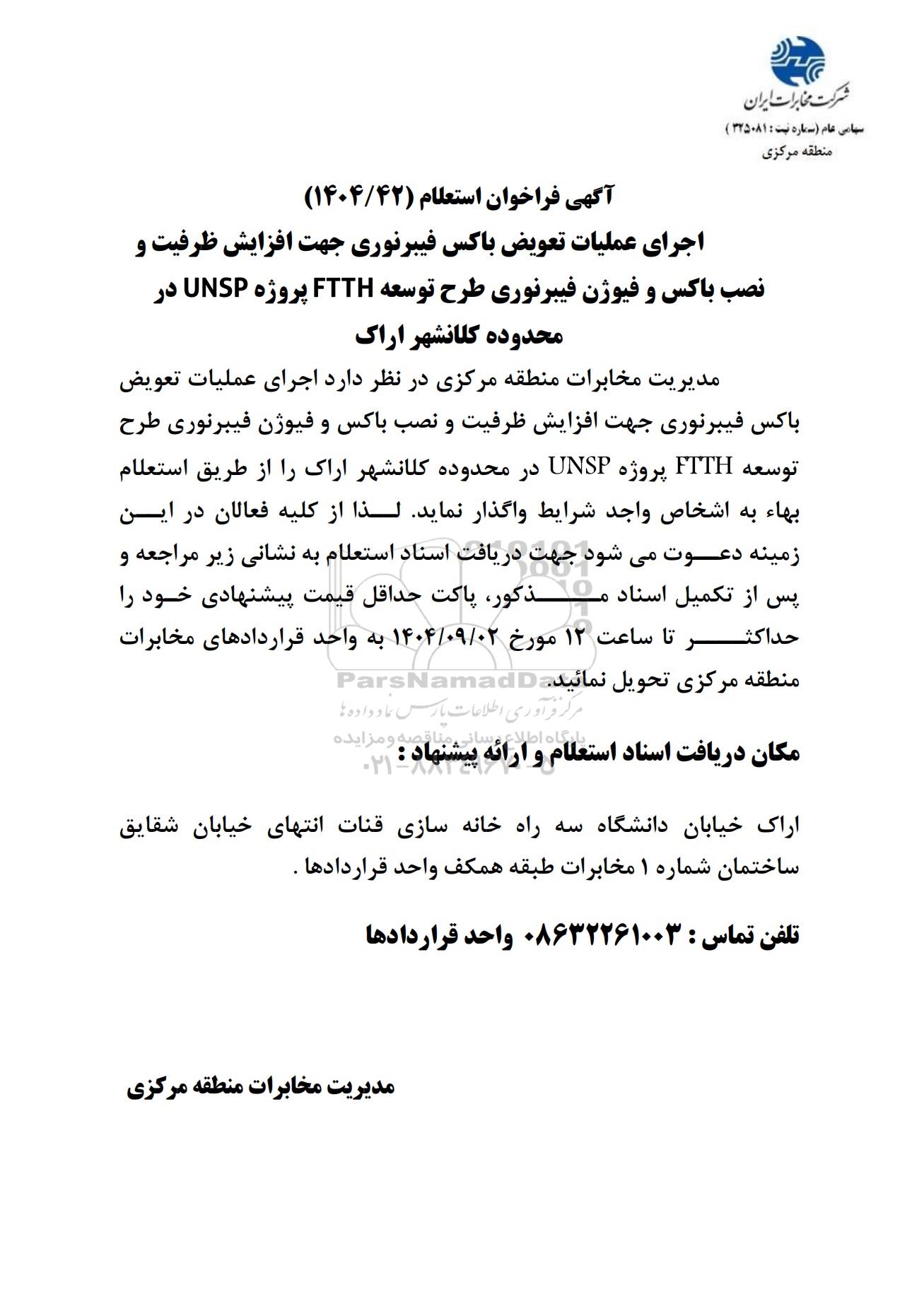 تلفن:5- 88349670 (021) فکس: 88349673 (021) Website: www.ParsNamadData.com E-mail: Info@ParsNamadData.com فراخوان استعلام اجرای عملیات تعویض باکس فیبرنوری جهت افزایش ظرفیت و نصب باکس و فیوژن فیبرنوری طرح توسعه FTTH...