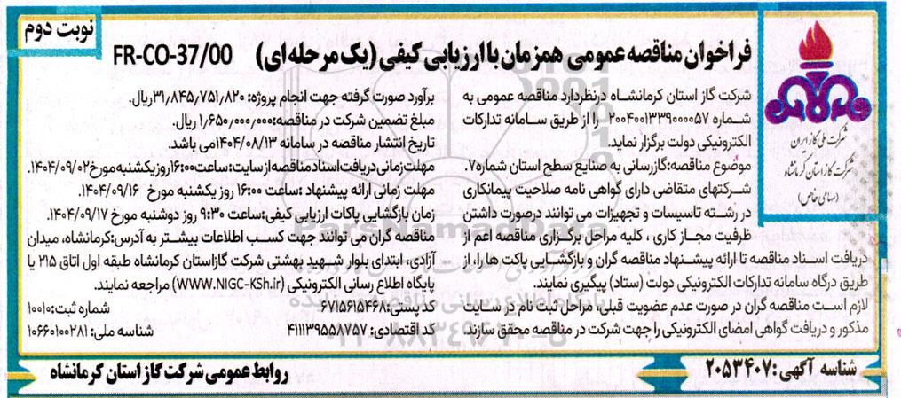 شرکت گاز استان کرمانشاه در نظر دارد مناقصه عمومی به شماره 2004001339000057 را از طریق سامانه تدارکات الکترونیکی دولت برگزار نماید.